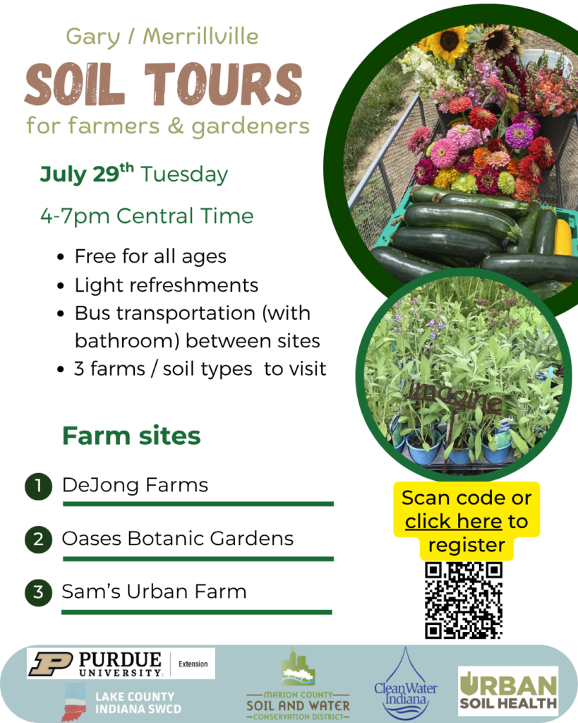 Purdue Extension-Lake County is partnering with Lake County Soil and Water Conservation District, and Urban Soil Health to hold a Gary/Merrillville Soil tour for farmers and gardeners on Tuesday, July 29, 2025 from 4:00 p.m. to 7:00 p.m. Central Time. Farmers and gardeners will learn about soil health practices. Bus transportation will be provided to the program locations. We will offer light refreshments. The Gary and Merrillville locations will be disclosed closer to the date of the event. Interested parties can register by July 15, 2025.