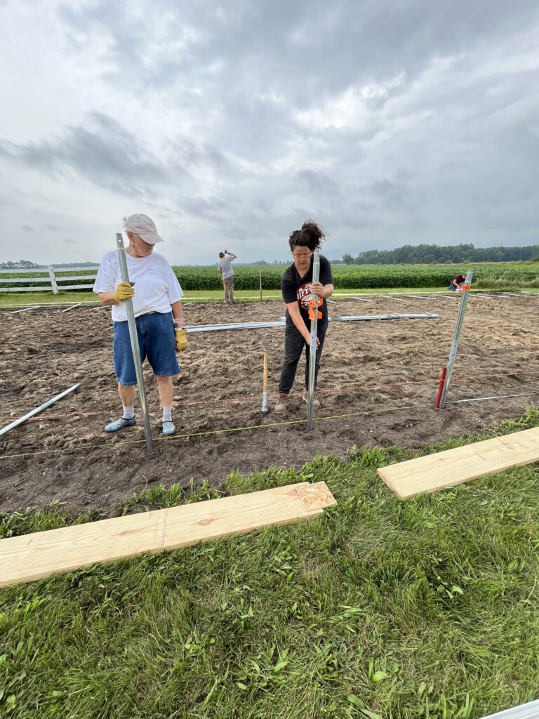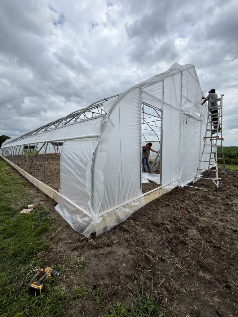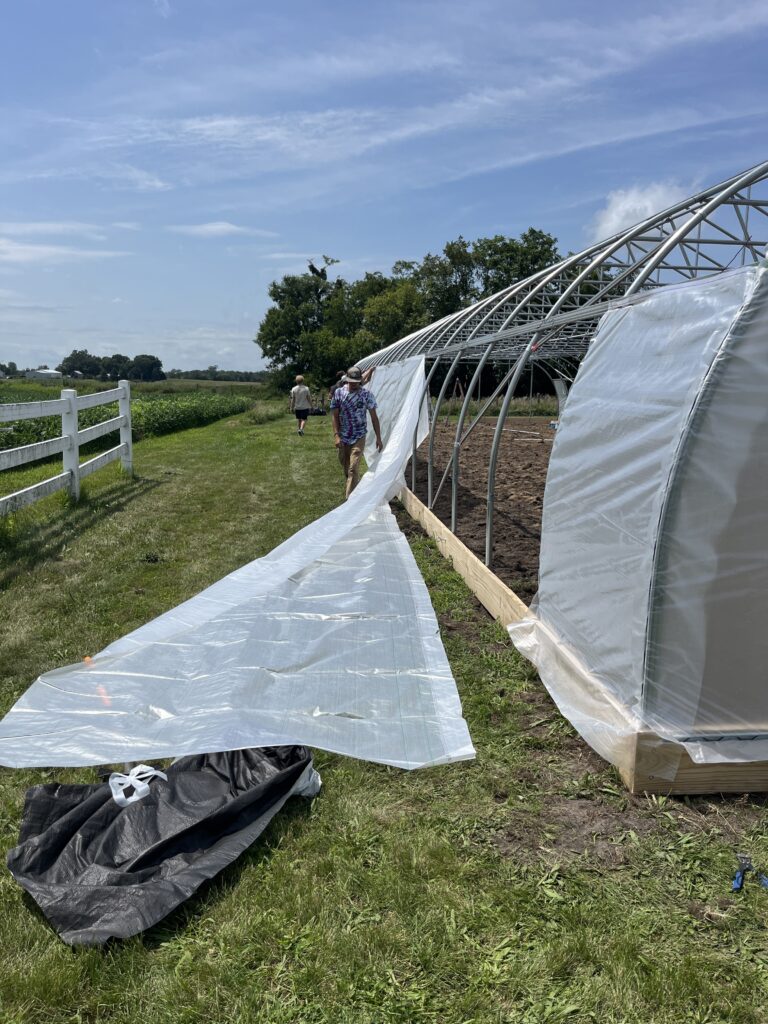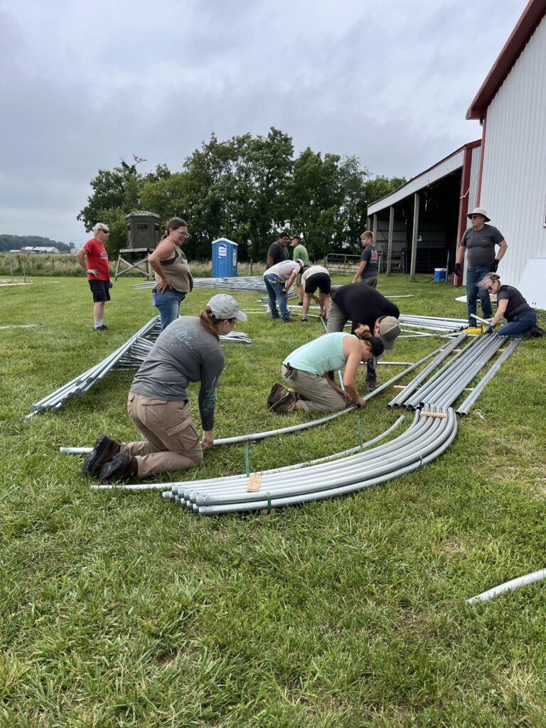 On a beautiful Monday in late July, rain threatened on the horizon but, thankfully, did not come to fruition. With guidance from the Nifty Hoops team leading the build, local community members, Soil and Water Conservation Districts (SWCD), Natural Resources Conservation Services (NRCS), and aspiring high tunnel growers rolled up their sleeves and got to work.